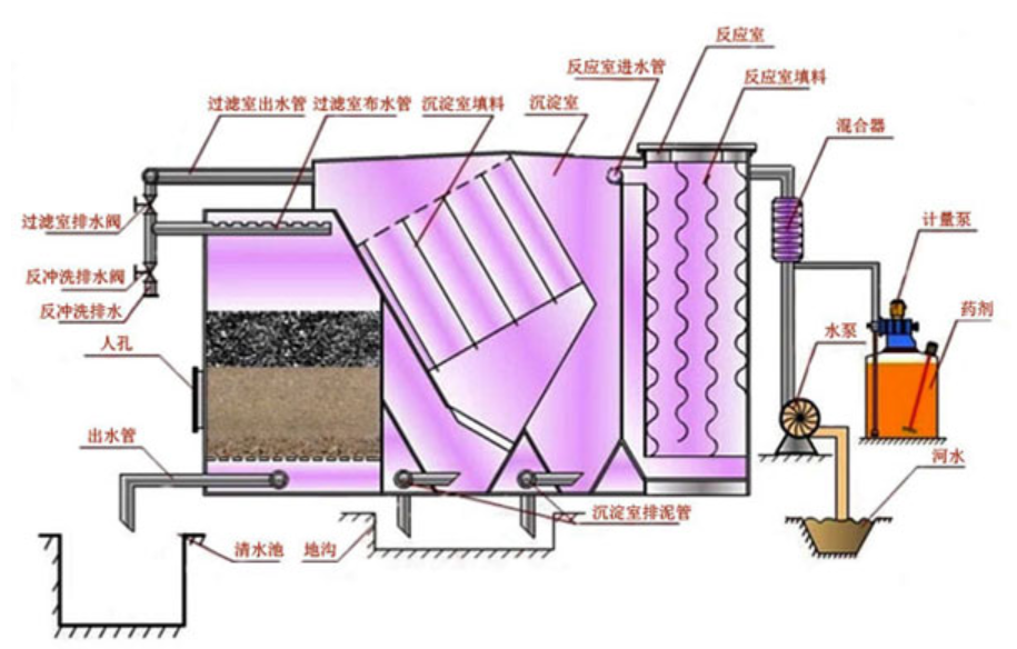 一體化凈水設備和城市供水廠的凈化流程一樣,它有混凝池、沉淀池、過濾池、水質穩(wěn)定裝置、反沖洗裝置、水泵及電氣控制。